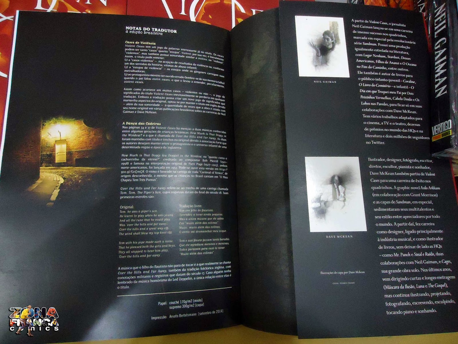 As carreiras de Neil Gaiman e Dave McKean nos quadrinhos começaram aqui. Em um conto magistral sobre um garoto, seu osteopata, a confiabilidade da memória, Al Capone e violência. Mais de vinte e cinco anos depois, a obra, em uma edição remasterizada e com novas cores, volta a provar porque os autores tornaram -se dois dos mais respeitados contadores de histórias da atualidade ." Parte memórias de infância, parte reconstrução de um passado brutal, parte comentário sobre a magia que se recolhe das recordações, Violent Case evoca sensações pouco familiares de forma não