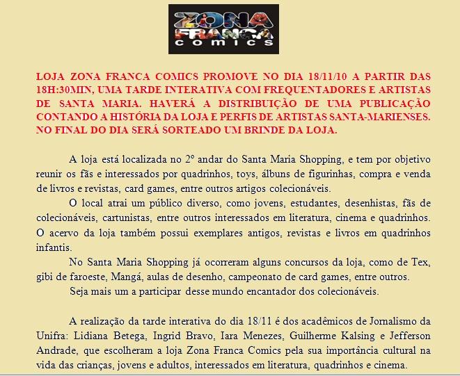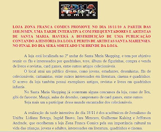 de Santa Maria. Desta vez através de uma promoção dos academicos de jornalismo da Unifra em parceria com a loja estaremos agitando um encontro informal de amigos e frequentadores da loja e alguns cartunistas e desenhistas da cidade.O projeto do pessoal da unifra é bacana e para nós é gratificante sabermos que estamos sempre na " cabeça" deste pessoal engajado que tem uma grande afinidade com a nona arte!