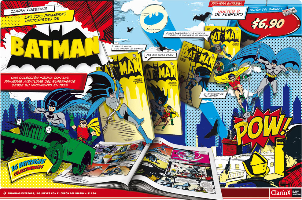 Um dos mais importantes jornal Argentino – El Diario Clarin - , um dos de maior circulação em todo o país, volta a apostar nas histórias em quadrinhos! Ou mais expecificamente pelas histórias em quadrinhos da IDADE DOURADA! Pois a partir do dia 02 de Fevereiro e durante mais 16 semanas, juntando um cupom que vem com o “ Diario” + 12,90 ( pesos ) – aproximadamente 5,50 Reais – os leitores argentinos receberam um volume da coleção “ LAS 100 PRIMERAS HISTÓRIAS DE BATMAN” ! O primeiro volume tem preço promocional de 6,45 pesos!