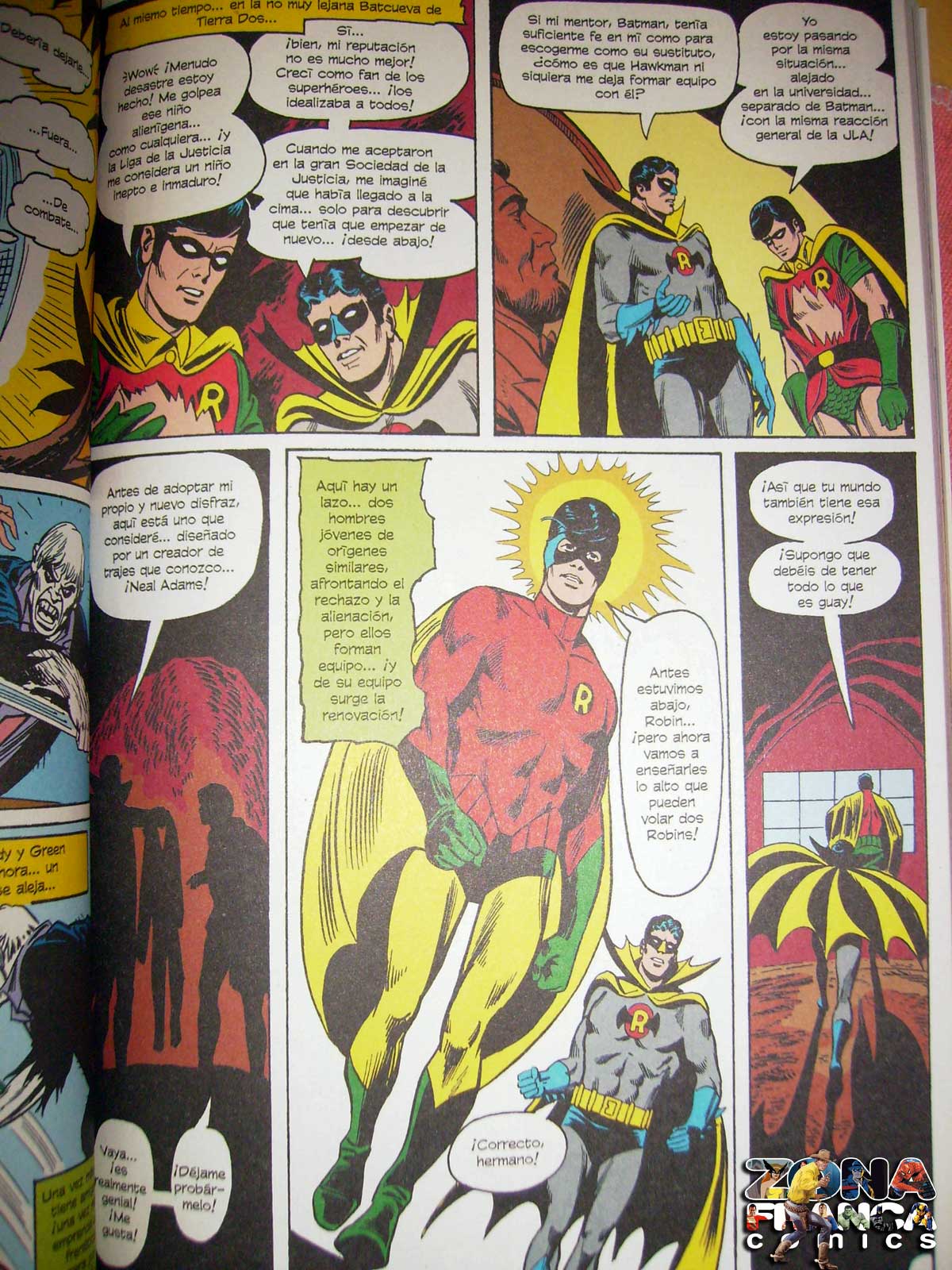 que havia me passado despercebido da primeira vez que li CRISIS EN TIERRAS INFINITAS VOL 3 da editora Planeta DeAgostini, edição Espanhola. A primeira vez que aparece o uniforme Vermelho e Amarelho do Robin da Terra II - vamos aos fatos :Em uma aventura em que a Liga da Justiça da América e a Sociedade da justiça, têm, mais uma vez que atuar juntos - justice league of america nº 92 - enfrentando a dois seres alienigenas e mais ao "monstro" Saloman Grundy, Robin da terra II leva sua contra parte até a Batcaverna e ali lhe mostra um novo uniforme que foi confeccionado por um famoso estilista chamado NEAL ADAMS!