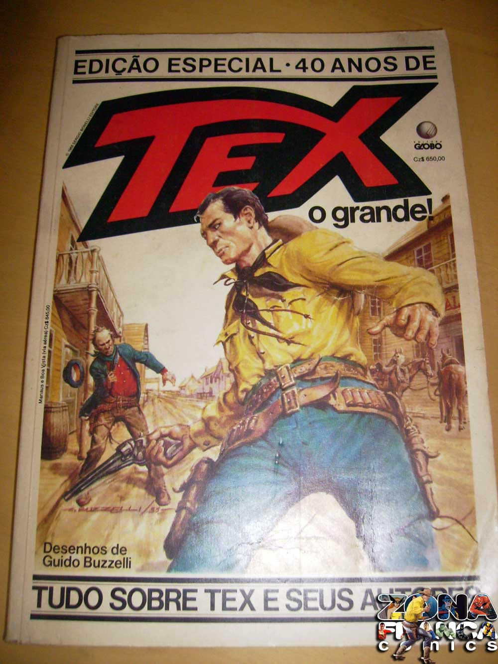 meio dos quadrinhos. E mais duas paginas com os autores do mundo do TEX. Então começa a grande aventura a cargo de CLAUDIO NIZZI e GUIDO BUZZELLI. São 222 paginas de uma expetacular aventura. TEX O GRANDE foi reeditado pela própria GLOBO alguns anos mais tarde, como comemoração dos 50 ANOS do personagem. Mas esta edição de 40 anos é especial e mais uma bela peça de coleção!zonafranca34@hotmail.com