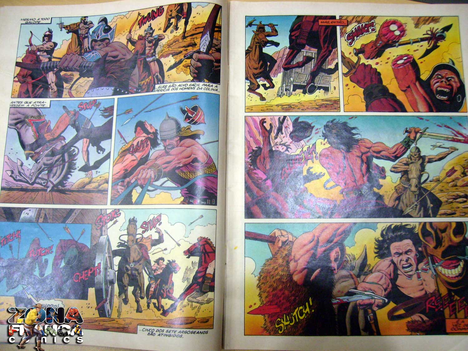 Enquanto o traço de Gulacy causa estranheza aos leitores do cimério, o texto de Moench é um manual de como fazer uma ótima história com elementos já explorados á exaustão da mitologia do personagem: traição,magia,sacerdotisas a serem salvas,mulheres a serem resgatadas,homens da nobreza a serem desafiados...Um artefato que liberta um demônio aprisionado...Uma guerra entre duas cidade :koth e Argos! Um tesouro a ser protegido e um espião traidor a ser desmascarado – todos estes ingredientes Moench MISTURA E COZINHA em 64 paginas desenhadas por seu grande amigo e companheiro de muitas aventuras GULACY e nos entrega uma excelente aventura de CONAN O BARBARO.